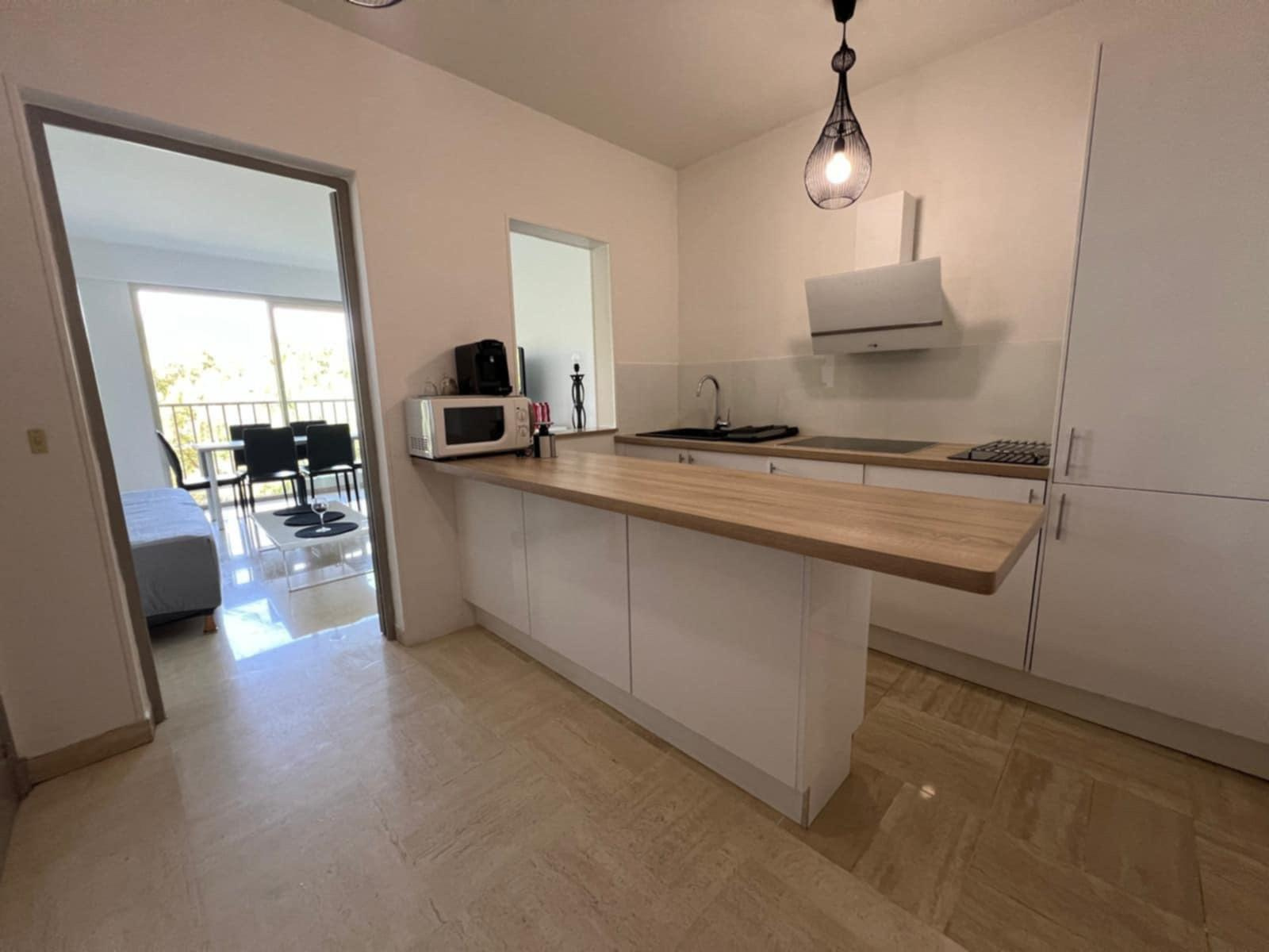 Un appartement comprenant deux pièces principales avec de nombreux rangements. Il dispose également d'une cuisine américaine tout équipée.